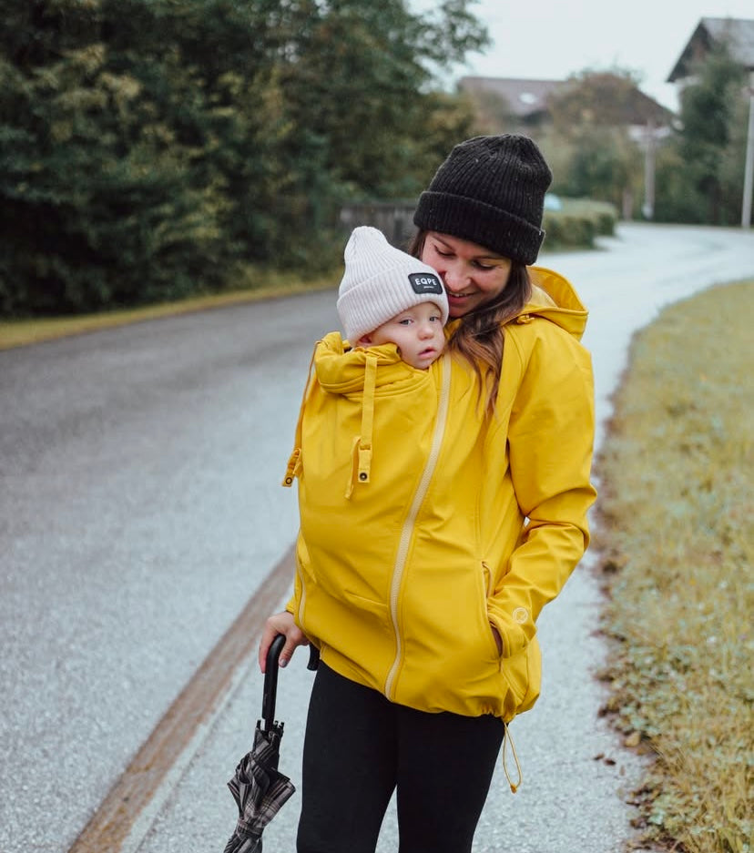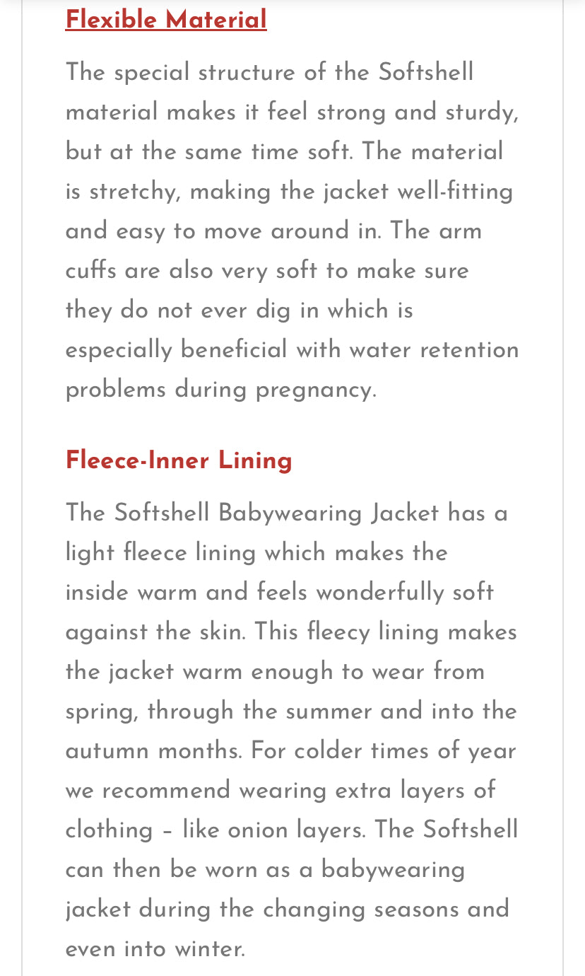 ‘This versatile Softshell Jacket for Two is a favourite for a very good reason! The award-winning Mamalila softshell babywearing jacket offers many unique features and can handle all kinds of weather. The fabric is fleece-lined. The jackets are wind- and waterproof, breathable and very versatile!’
